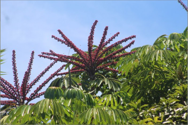 Figure 2 : L’arbre pieuvre (Heptapleurum actinophyllum) n’est pas encore classé parmi les espèces interdites. Il produit des centaines de milliers de graines qui sont consommées et disséminées par les oiseaux. Sa croissance rapide et son système racinaire agressif lui permettent de se développer jusque sur les roches volcaniques. Il est une vraie menace pour les forêts primaires de l’Est et du Sud de l’Île.
